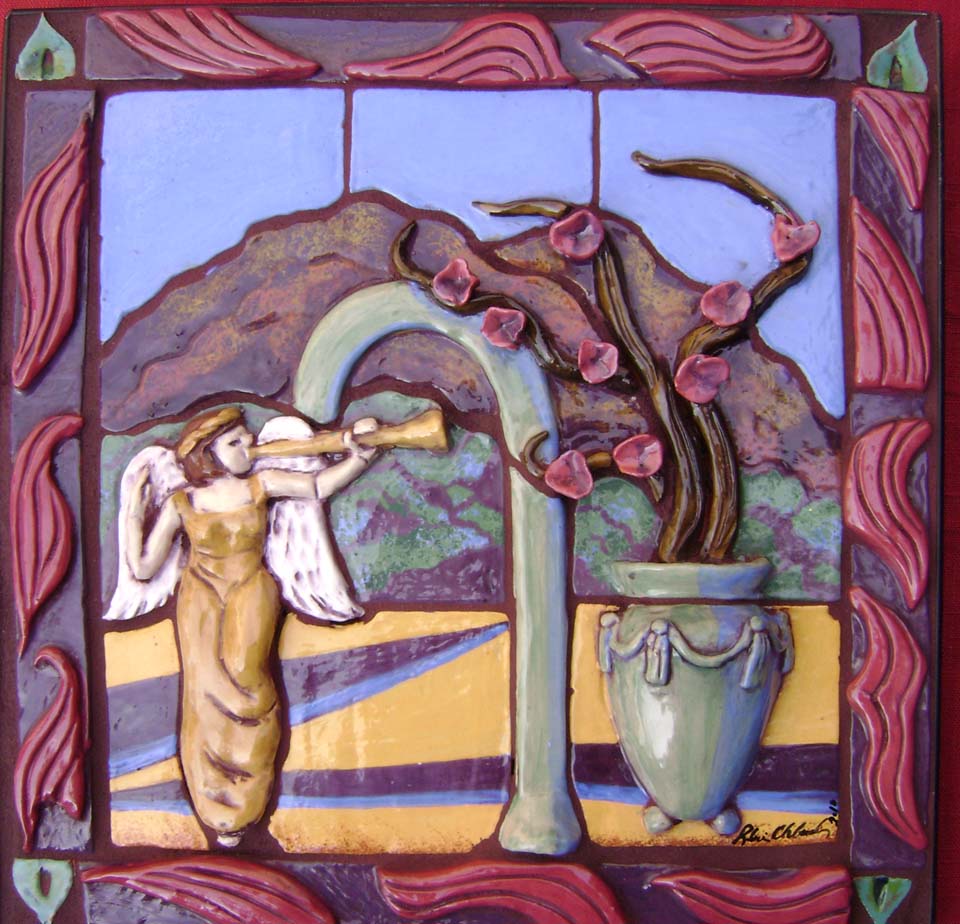Here are some of my archived images of tile trivets, a framed mural and a mural installation I have painted in the past. They are painted with many layers of colored slips and highlighted for shadowing with oxides. Any brand of underglazes will do, but it’s all in the way you place your colors against colored backgrounds that make them pop. That is the trick to making a mural come to life.