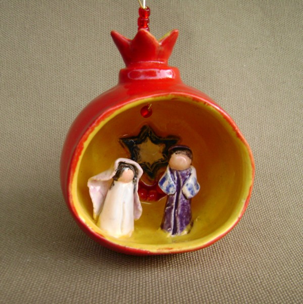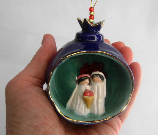 I also have keepsakes for weddings and anniversaries.   It’s a tradition to give a pomegranate to a Jewish wedding couple.  Why not give one that will last …forever!  Below are a few ceramic wedding pomegranate ornaments.  They are handmade.  The pomegranate is a biblical fruit mentioned in the book of Exodus.  It represents fruitfulness, prosperity and long life.  Some I have in stock, some are made to order.  Please contact me for special orders. It takes 2-3 weeks to make custom or to put a message on the ornaments.