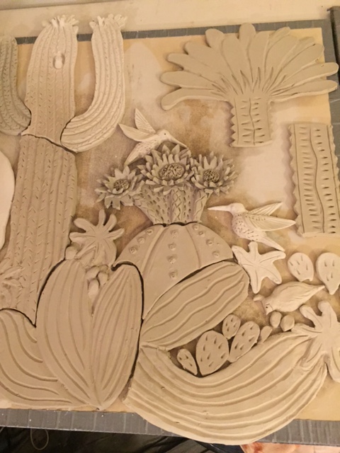 It is supposed to be ready by the end of the month. I will post more pics as the mural comes together. This shot is a fraction of the size. It will be 10′ w x 24″ h. installed in a stair well. It will be a combination of flat and low and high relief tile.