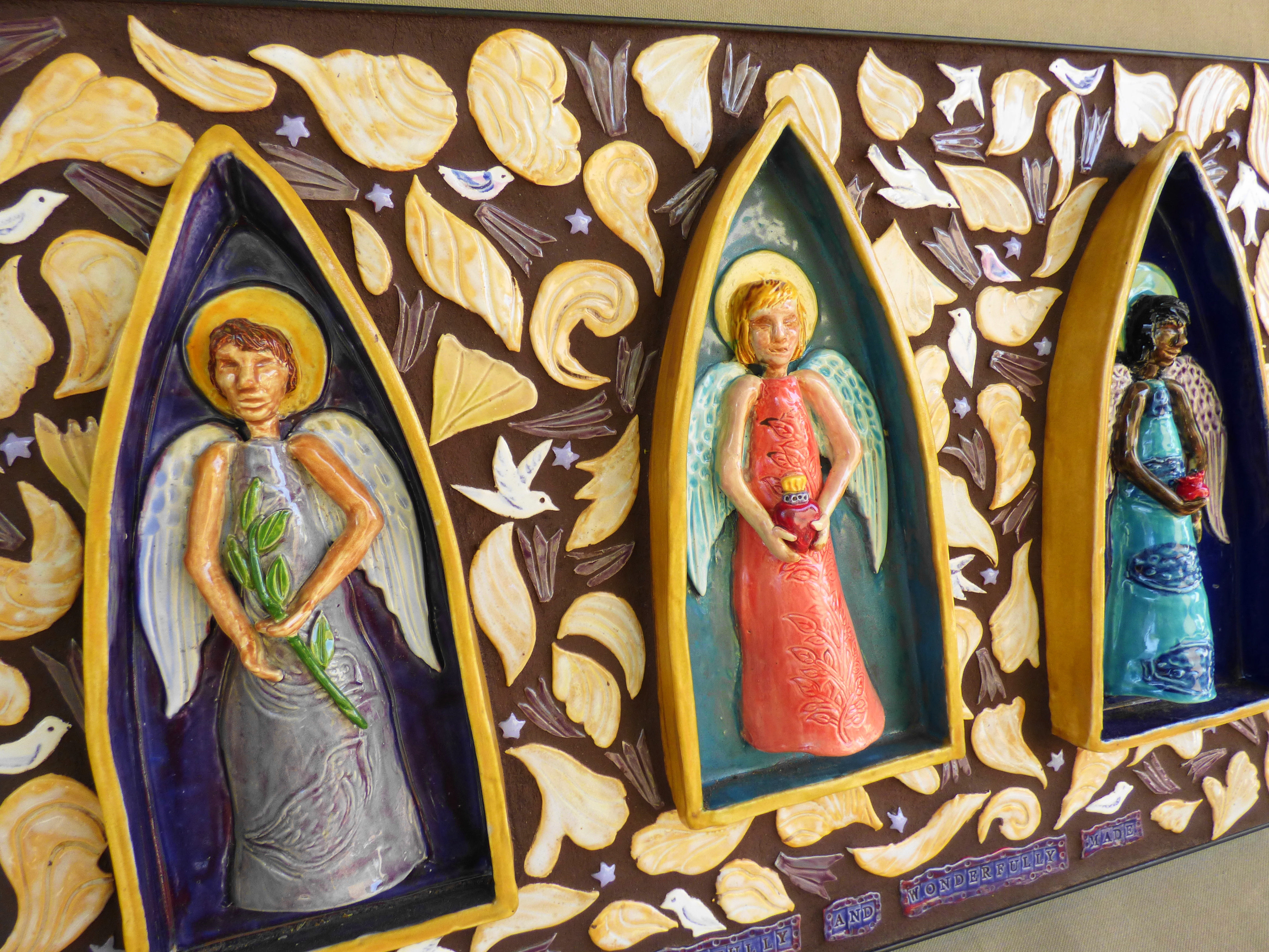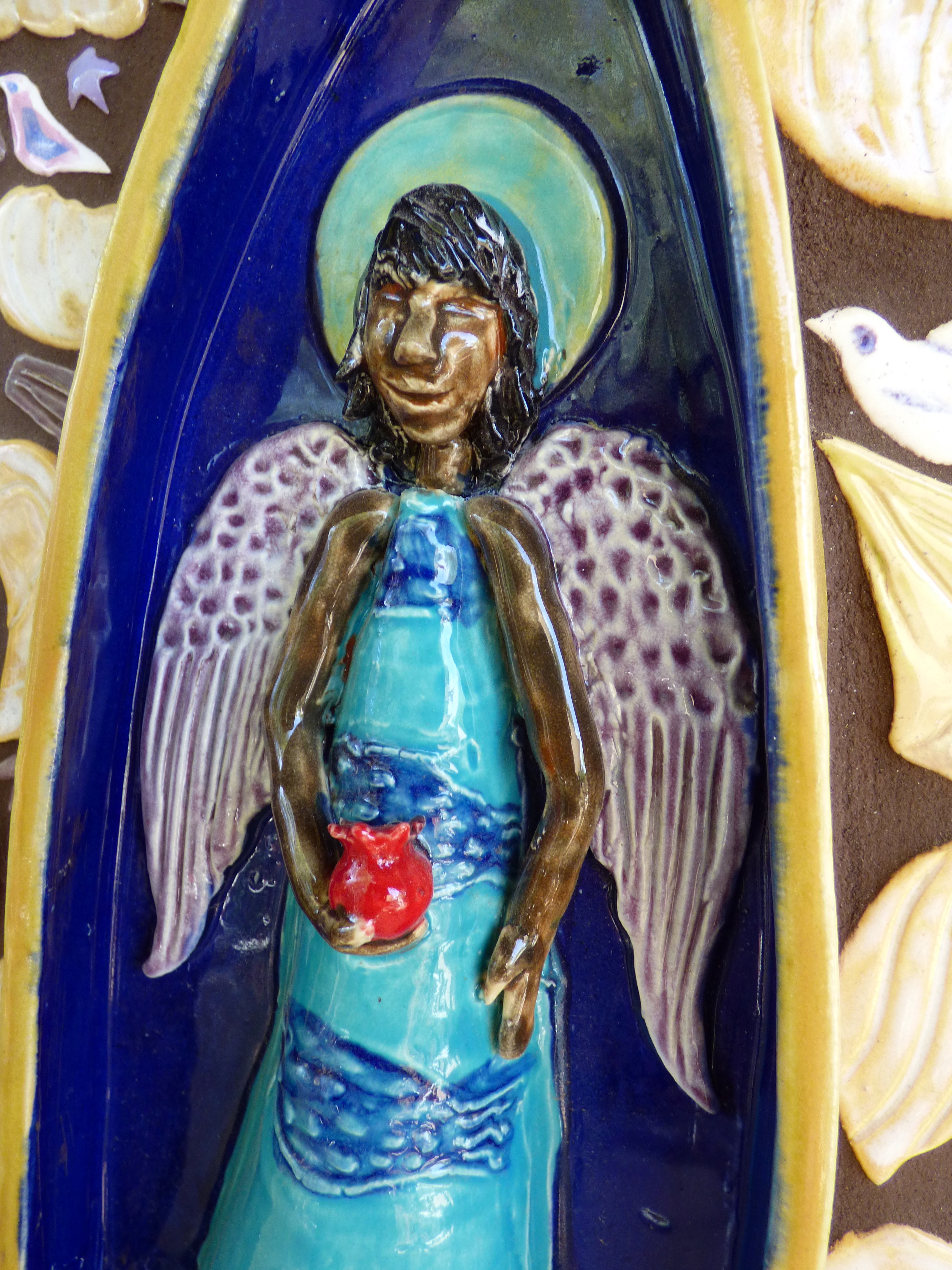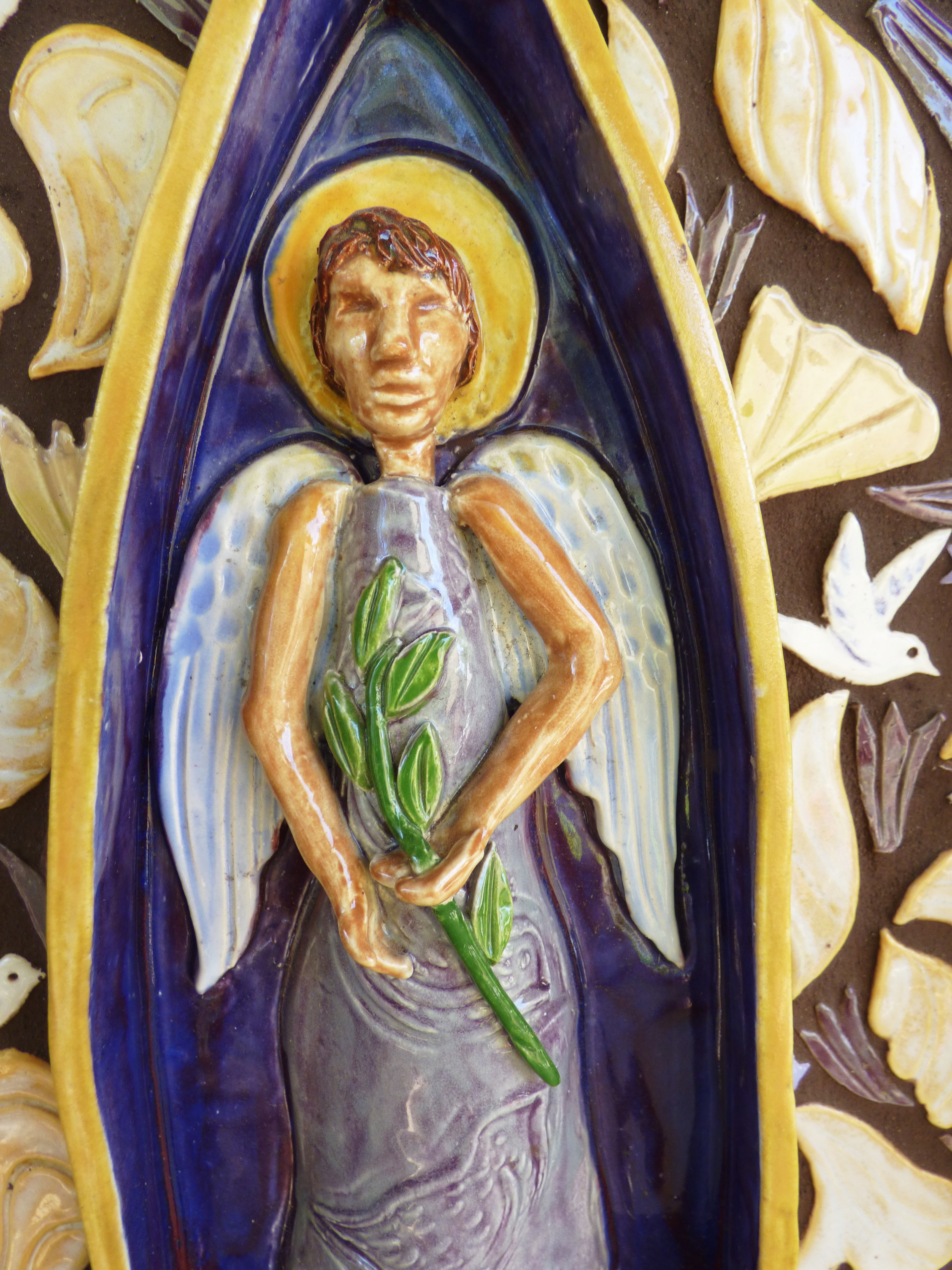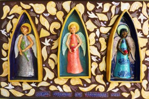 Each angel/ spirit holds a momento in their hands. The first on the left holds an olive branch, an offer of reconciliation. The middle one holds a sacred heart, the heart of Christ. The Angel to the right holds a pomegranate, offering fruitfulness, prosperity and generosity.