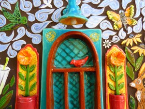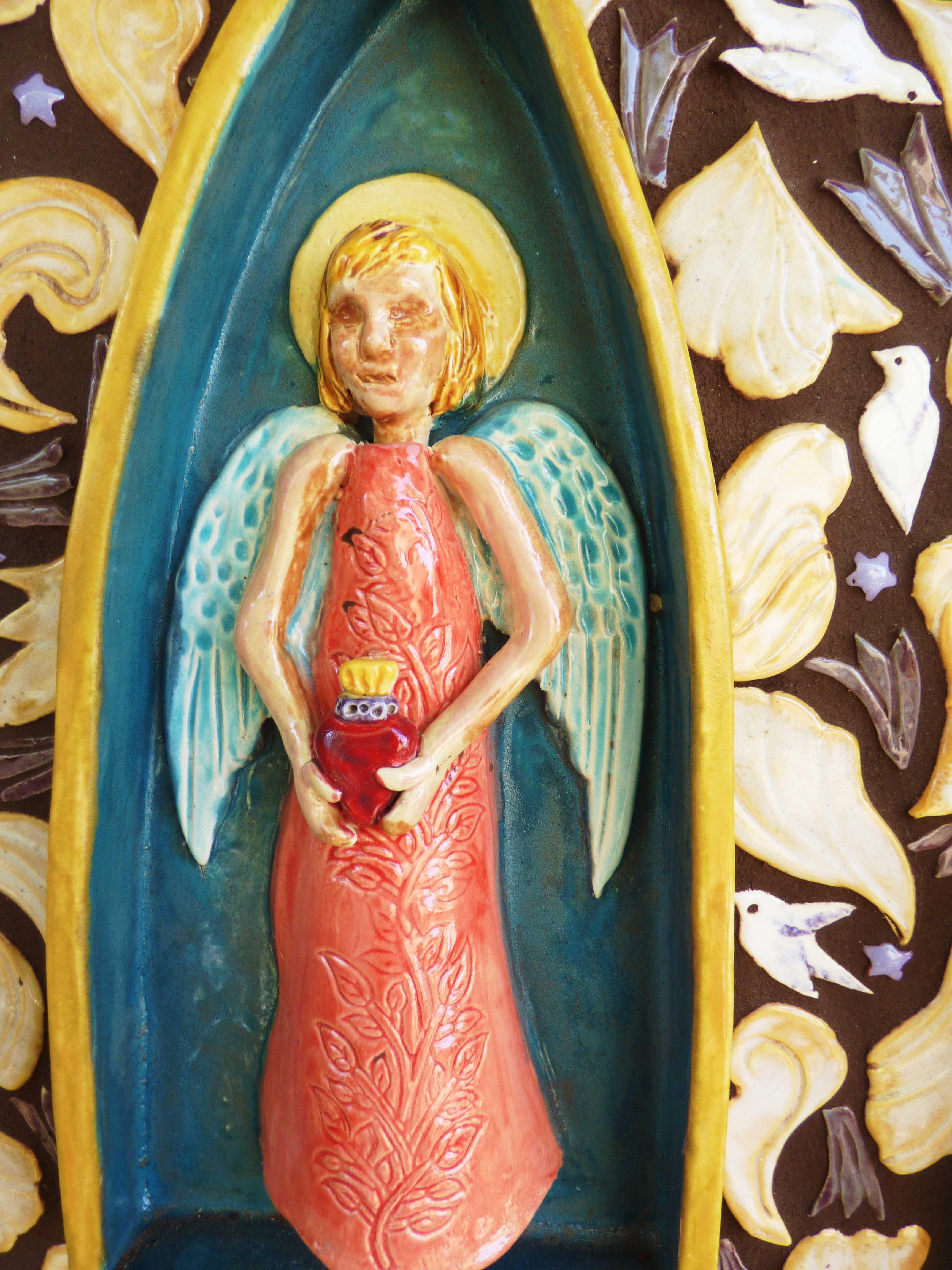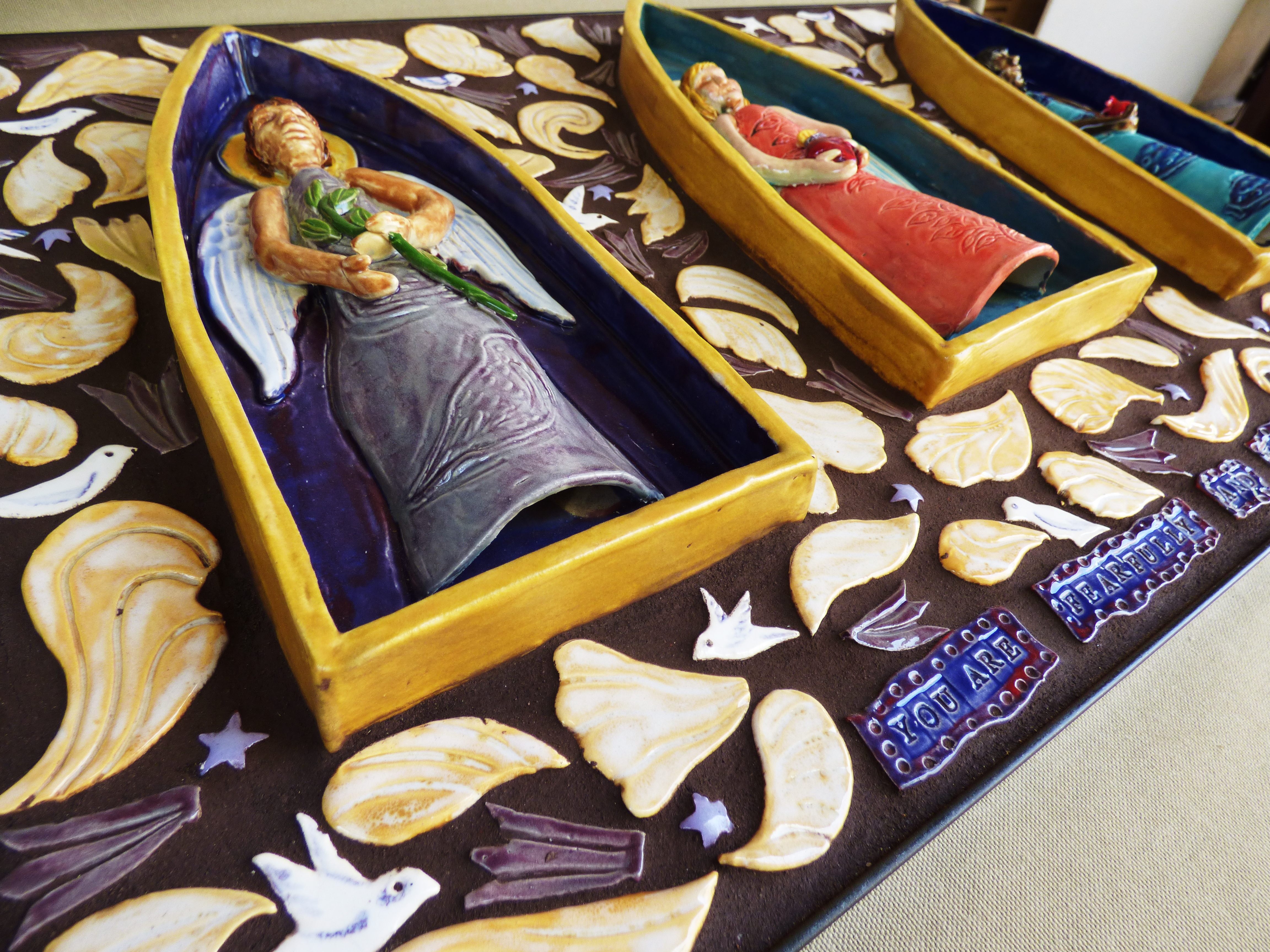 It’s a tile mosaic mixed with sculptural angels in boats. The boats frame the angels like a retablo.