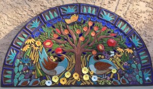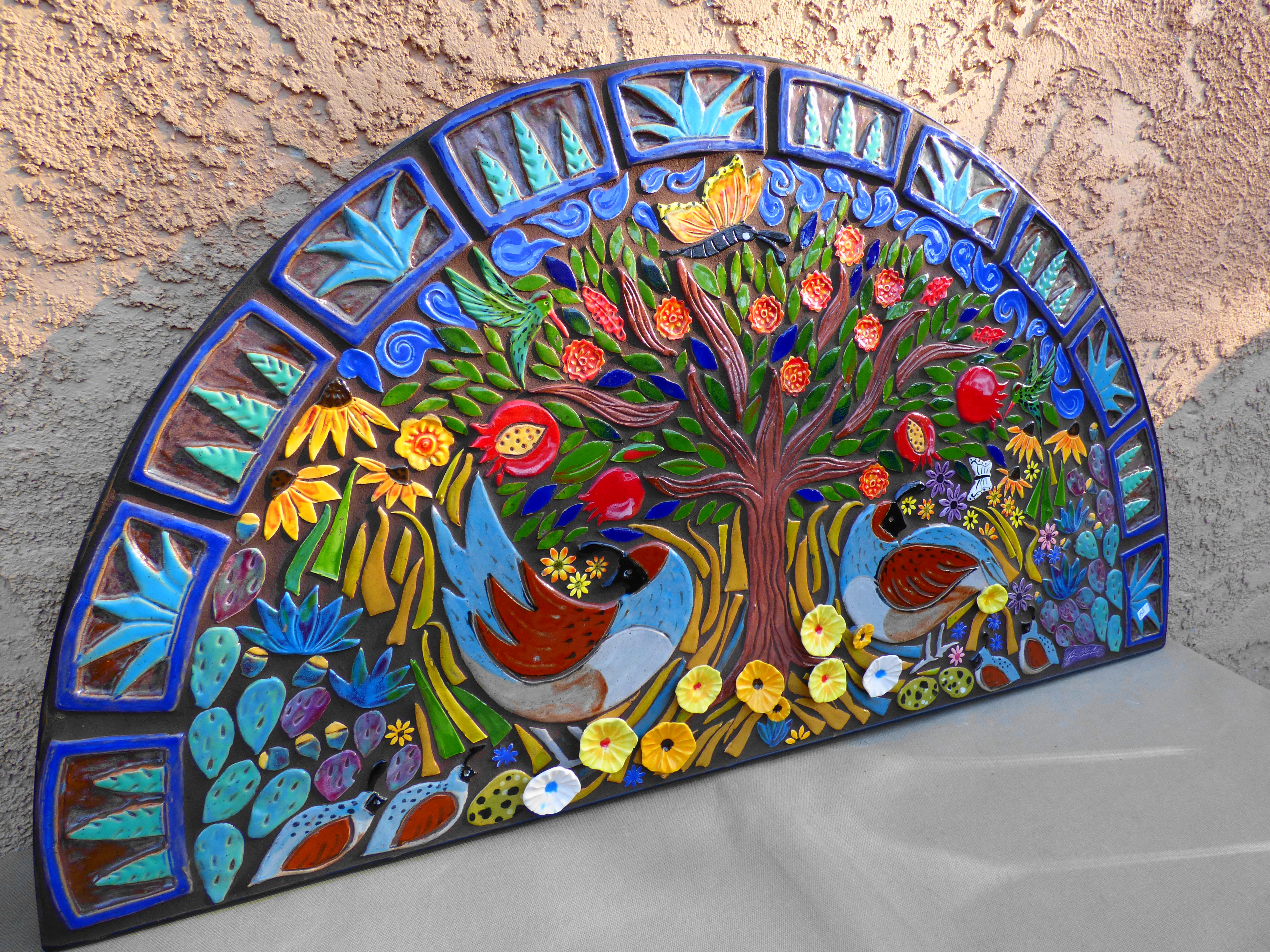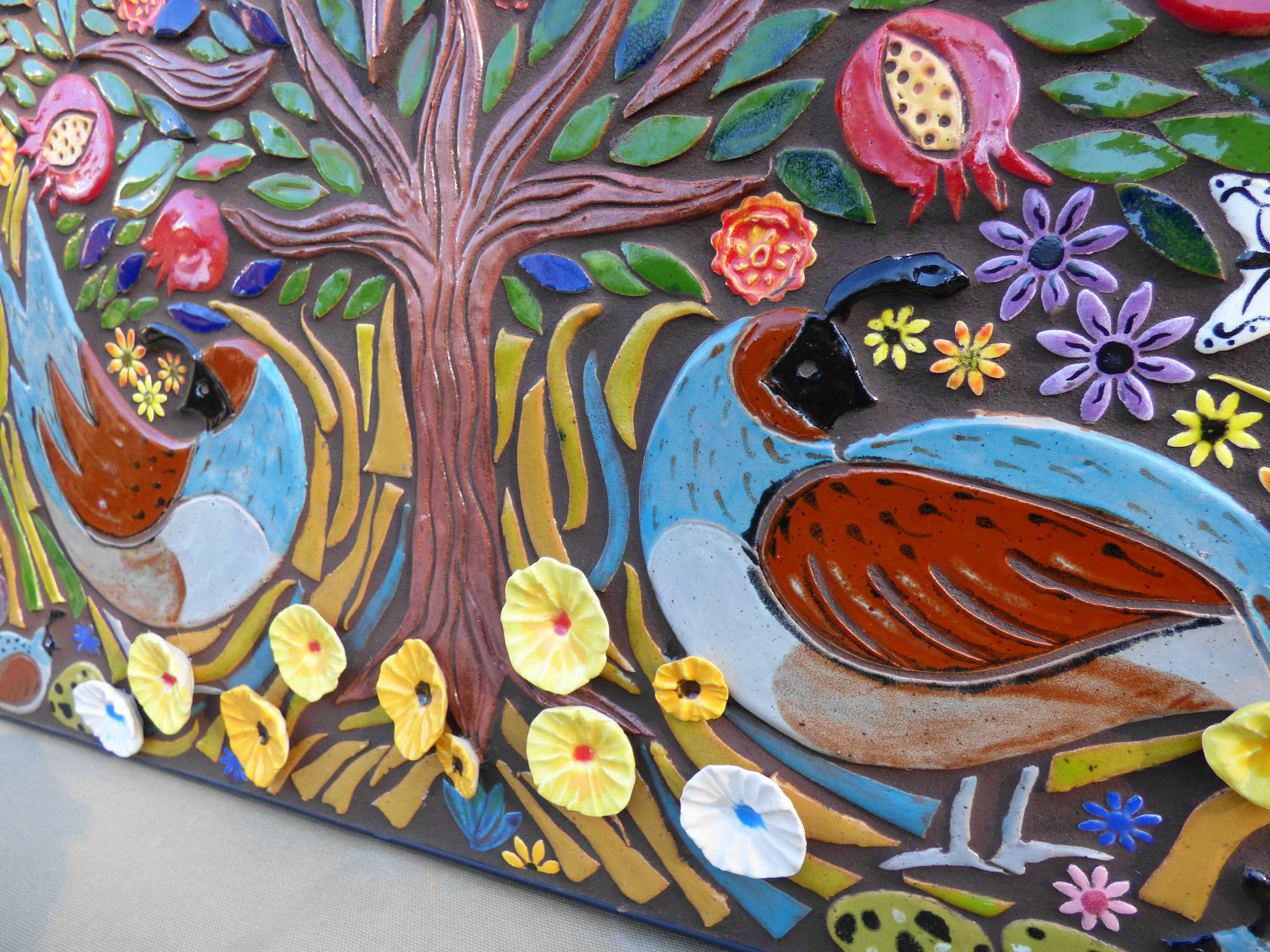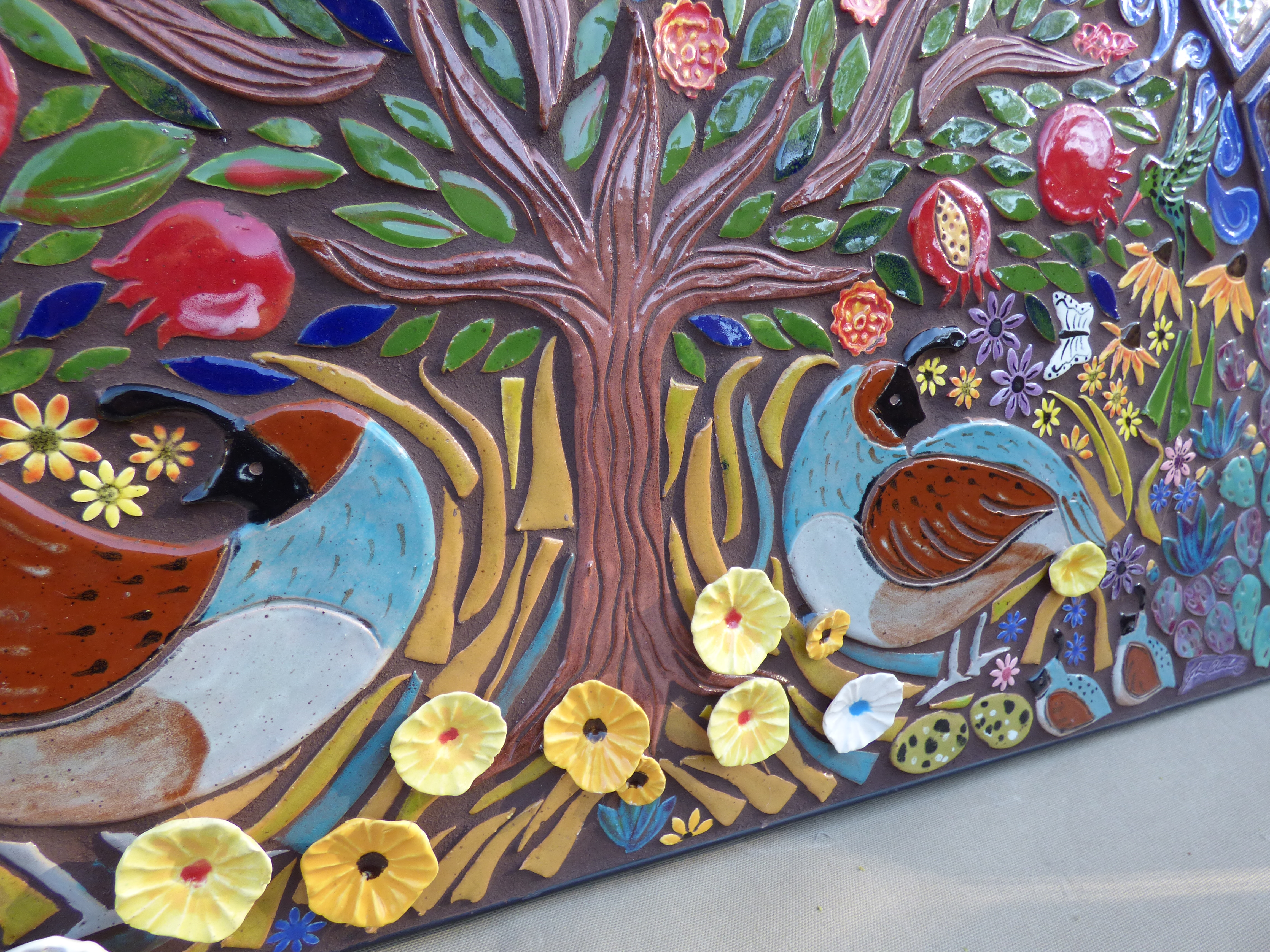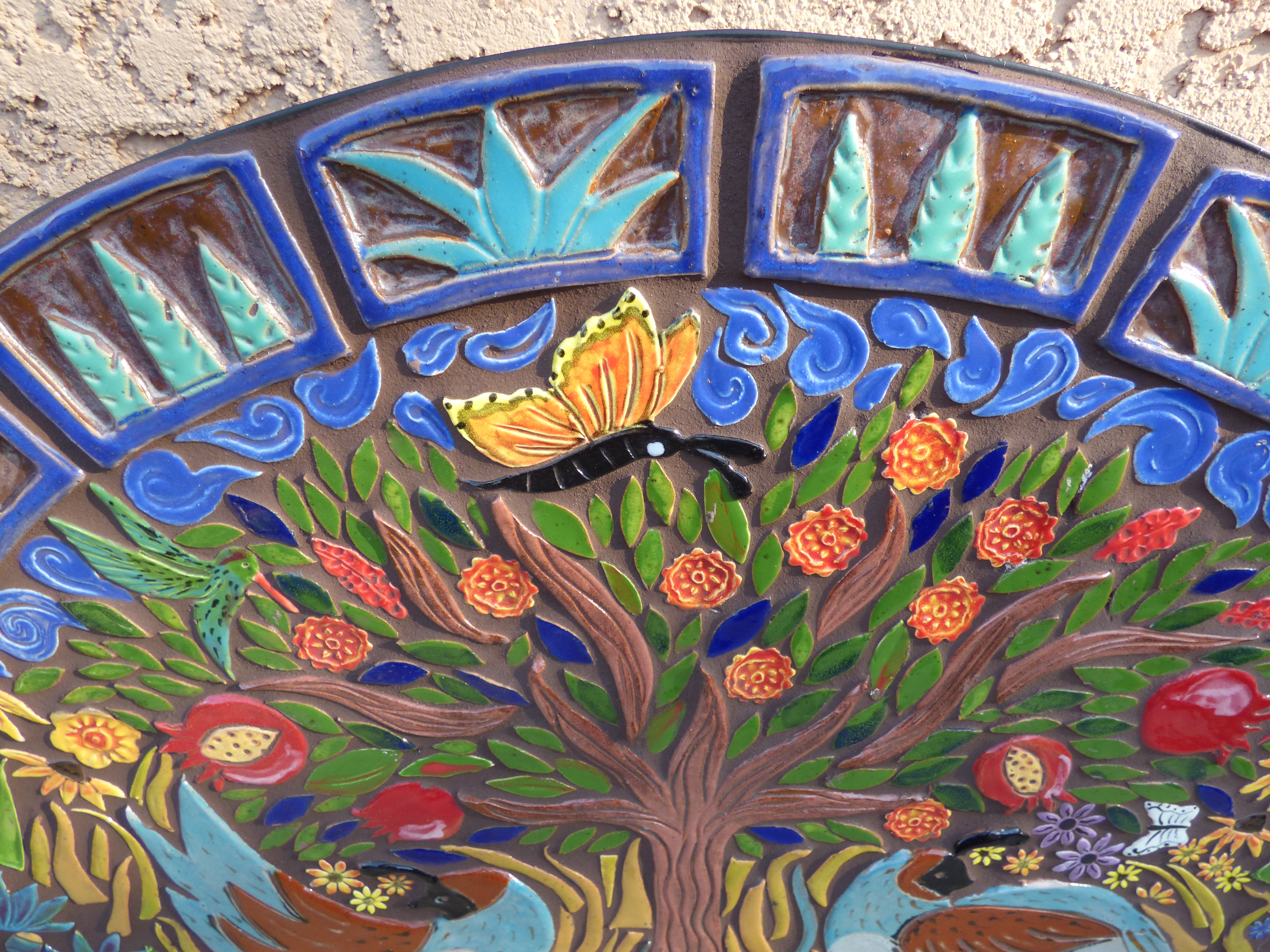 Many details in this project from quails and their chicks and unhatched eggs to butterflies, tree of life, pomegranates, flowers,hummingbirds and cactus to carved border tile.