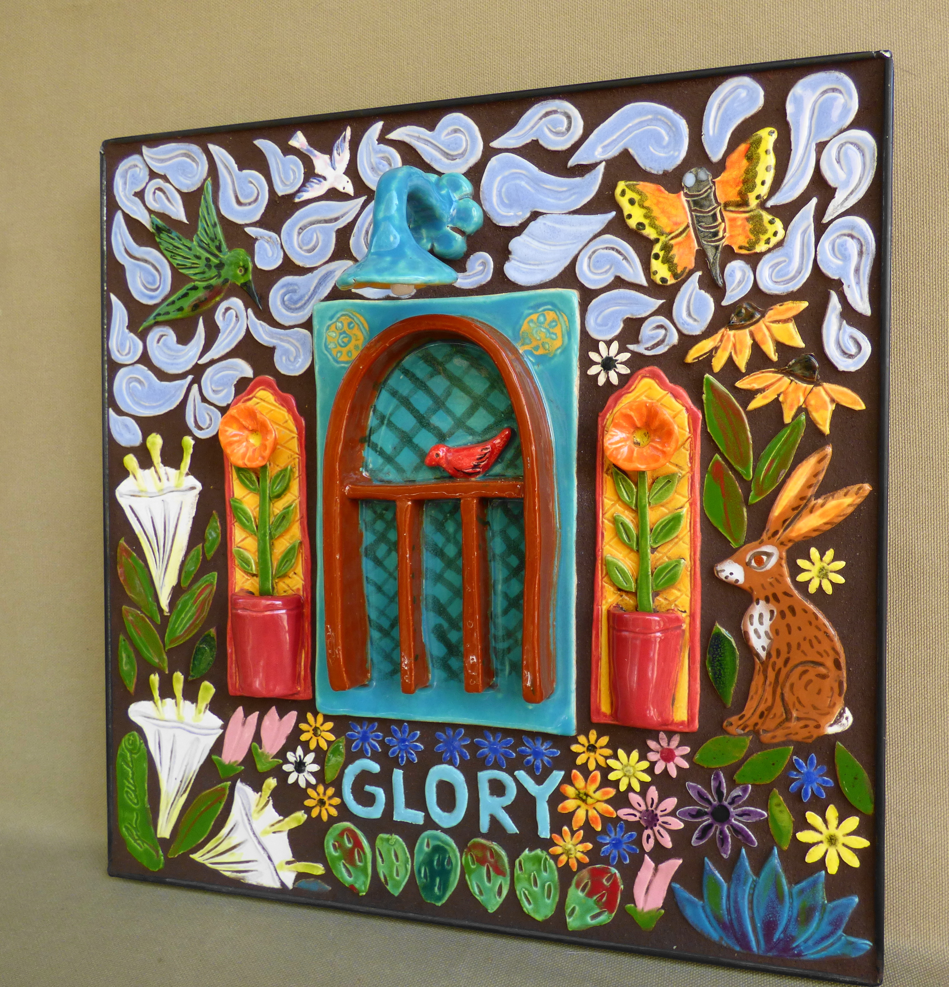 12″ square wall hanging set into a wrought iron frame, ready to hang.
