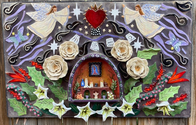 As you can see below in the Angel Shrine created 2002, with the purple grout has faded a bit toward the top. It has had filtered shade for the past 9 years. (I need to give it a bath.) But it has held up fairly well for being close to 20 years old. Take note the tile is still very vibrant with the exception of a little dust.
