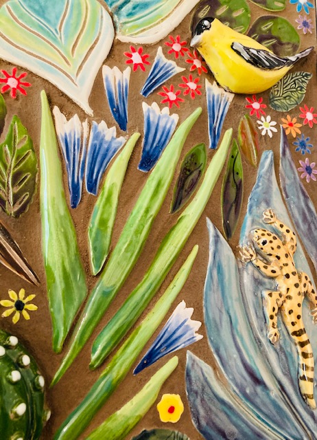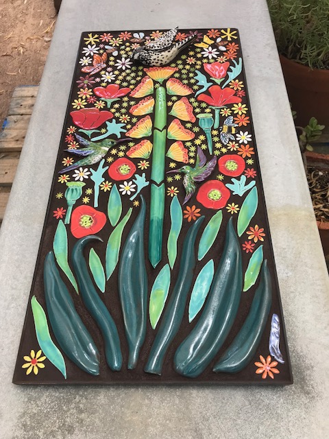 30″ x 16″ Mosaic panel, handmade tile, hand sculpted aloe flowers, aloe plants, gold finches, barrel cactus, gecko. Ready to hang, indoor/ outdoor.