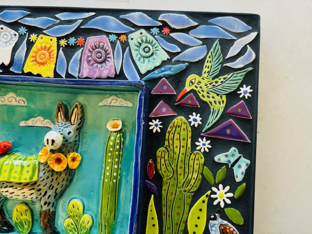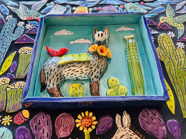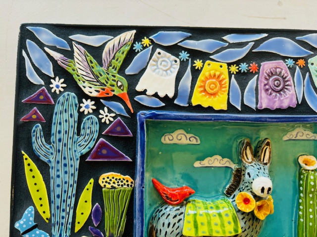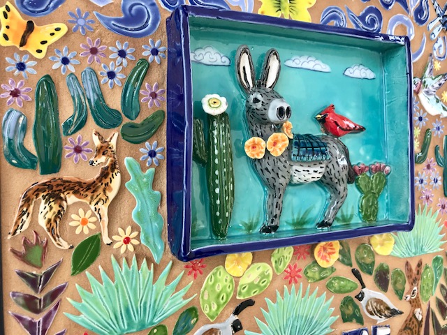 Sculpted low relief donkey and cardinal shadow box centered with a mosaic desert landscaped handmade tile. Sprinkled with cactus, wildflowers,