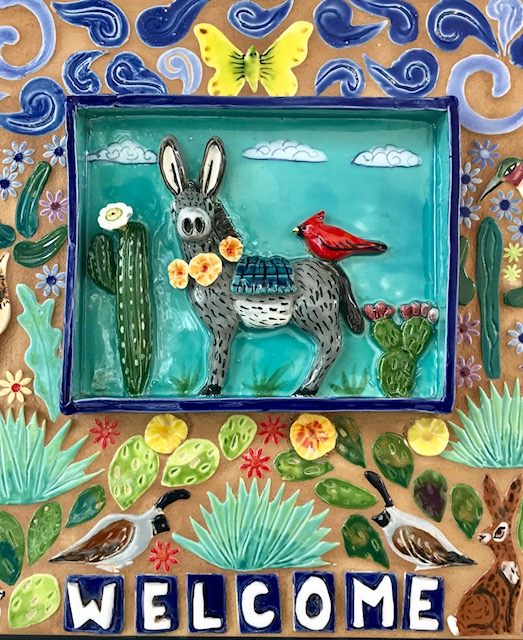 Small sculpture donkey and a cardinal shadow box combined with a mosaic in a desert setting. There so many details in this lovely wall art. Let this indoor/ outdoor mosaic greet your visitors with a cute welcome sign at the casita or guest house that reflects the Sonoran desert.
