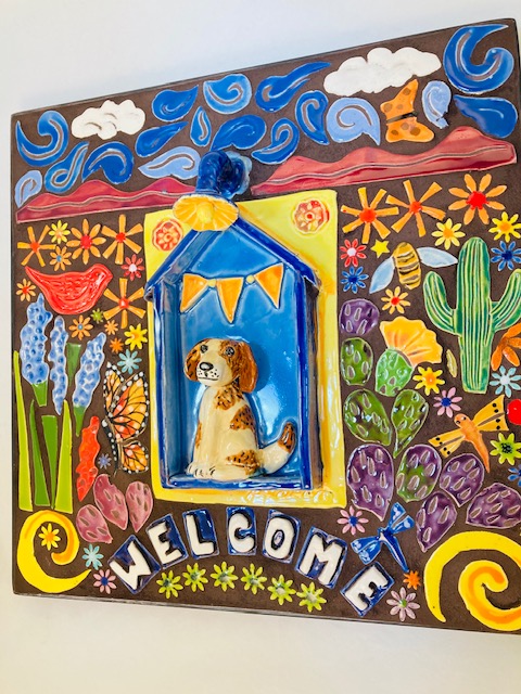 Adorable, whimsical, charming all in one. A mosaic welcome plaque for the pet lover! 12″ square, ready to hang, indoor/ outdoor. The house with puppy dog is hand sculpted with a 3-d night light over it. The welcome letters are hand cut and raised. Available at Wilde Meyer Gallery
