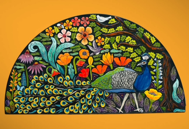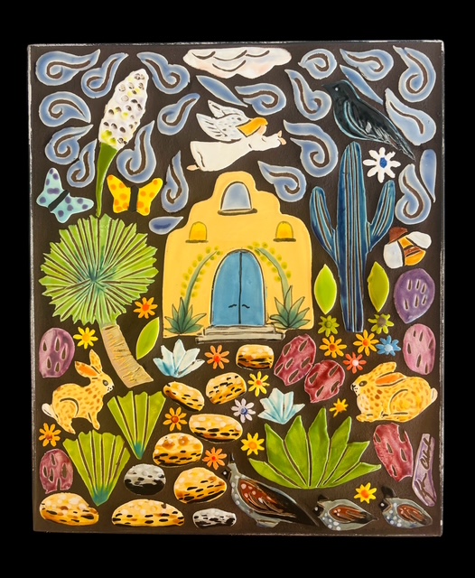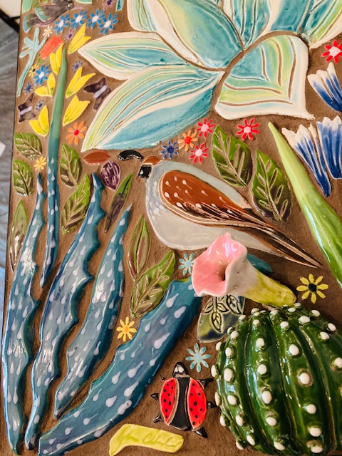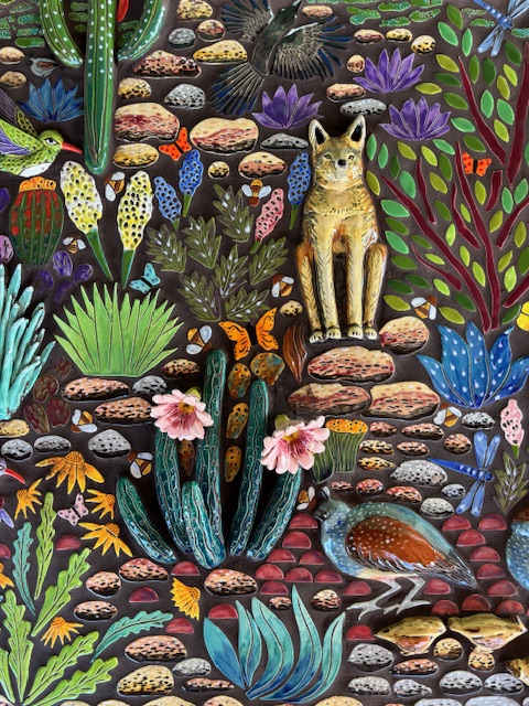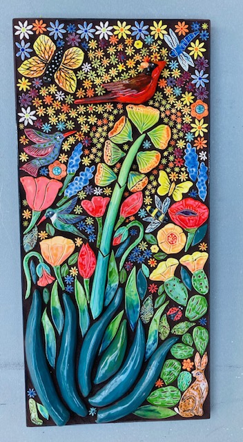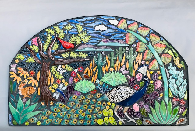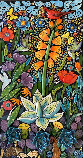 It has all the beautiful colors of a desert garden, featuring a flowering aloe, poppies, daisies, Santa Rita prickly pear cactus, a 3-d cardinal, sweet hummingbirds, Javalinas, and a rabbit hiding under the 3-d small agaves. So many little details. This one is at my studio for the time being. Measures 30″ x 16″. It makes a great addition to beautifying your outdoor living space.
