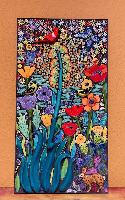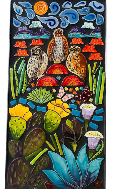 A gorgeous mosaic panel perfect for your outdoor art! Agave blooms with a cardinal perched on top poppies and finches and a rabbit in a garden setting. This piece is meant for a patio wall but it certainly can go indoors as well. 30″ x 16″ with 3-D accents. Let it inspire you. Available at Wilde Meyer Gallery.