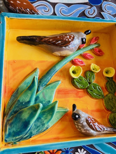 A bright and cheery mosaic wall piece for your entry way or patio wall. This charming quail mosaic is an eyeful of desert plants, flowers and birds with fluffy clouds and fluttering butterflies. Hand built ceramic shadow box center piece holds a pair of quails with prickly pear cactus and flowering agave, surrounded with handmade tile, grouted in a wrought iron frame. Measures 16”w x 14” h x 2′ d. Hangs with wire. Indoor or outdoor art! Available.