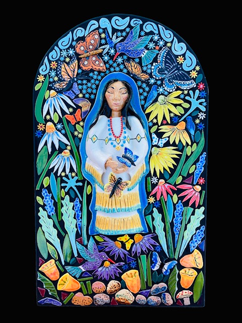 As she prays, she kneels among the butterflies, hummingbirds and wild flowers. This is an inspirational wall piece. Mariposa is a Native American girl coming of age. Hand sculpted, high relief. 20″ x 16″ X 3.5″