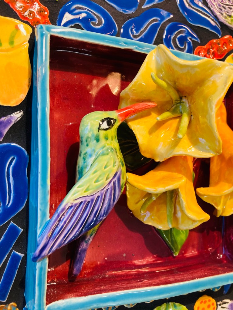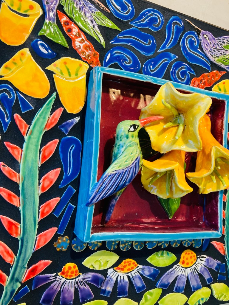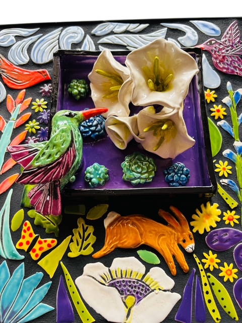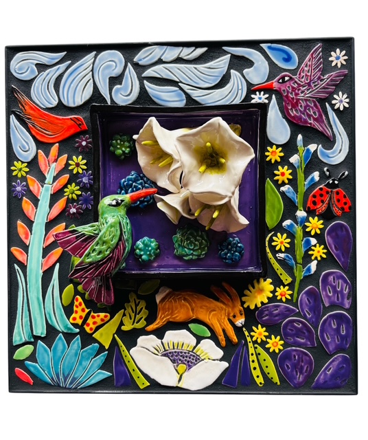 A sweet scene you might be lucky enough to see daily in the garden… a busy hummingbird searching for nectar from a honeysuckle bush. This is a high relief ceramic sculpture shadow box surrounded by handmade mosaic tile, set in a wrought iron frame, ready to hang on your wall. Available direct! And just in time for Mother’s Day.