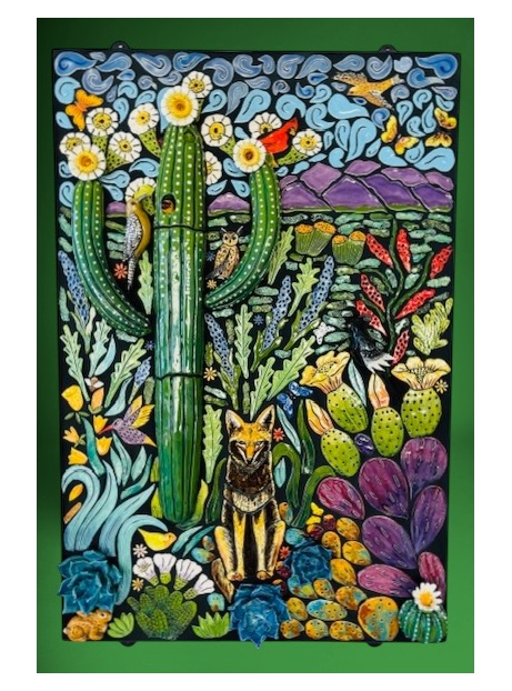 “The Watcher” A lone Coyote sitting and watching. This is a large mural with low relief Saguaro cactus tile, all handmade tile, of a coyote, sculpted birds saguaro flowers, and more. 36″ x 24″. Hangs indoor or out.