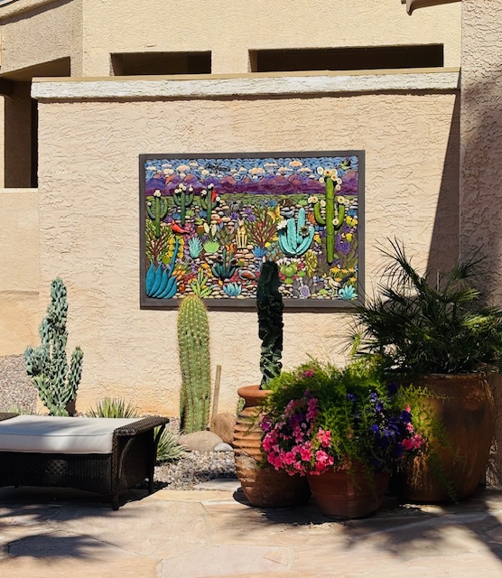 Also on the left is a giant 3-D Saguaro cactus with flowers, quails, and wild flowers. This piece is” 36″ x 32″ I will be posting an update once installed. Consider a custom piece for your home or patio. I love to work with the visions others have to create an art piece they will treasure for a life time.