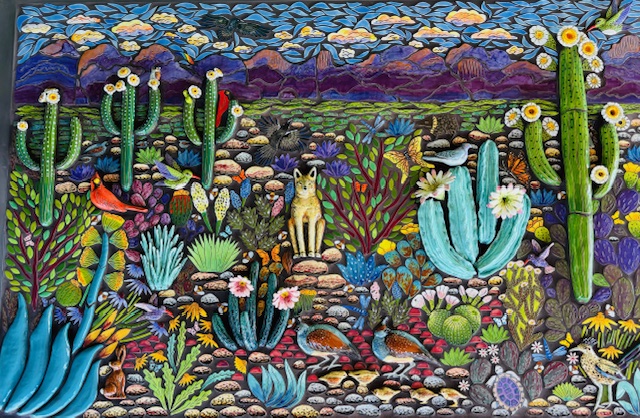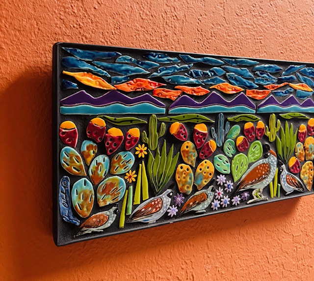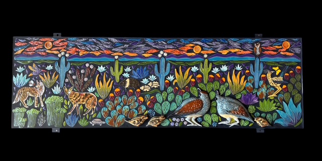 Like the ‘Saguaros in Bloom’ mural, it has many critters, cactus , birds, purple and orange mountains with low and high relief applications. It is a piece that needs to be seen with the naked eye to appreciate all the details.