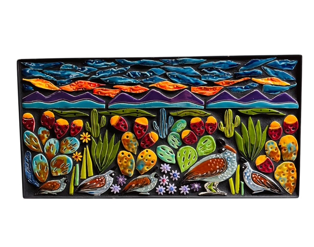Here is a beautiful wall piece for your indoors or out! It captures the desert landscape in the violet hour (sunset) as the prowling coyotes make their way across an enchanting land filled with saguaros, prickly pear cactus, agaves, and critters. The quail family are low relief sculpted. All tile is handmade, hand glazed and kiln fired.