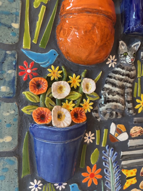 Made with kiln fired handmade tile, glued on a backboard in a wrought iron frame, grouted in. A wire for hanging is on the back. This piece can be displayed indoors or out. Available at Wilde Meyer Gallery. Sold!