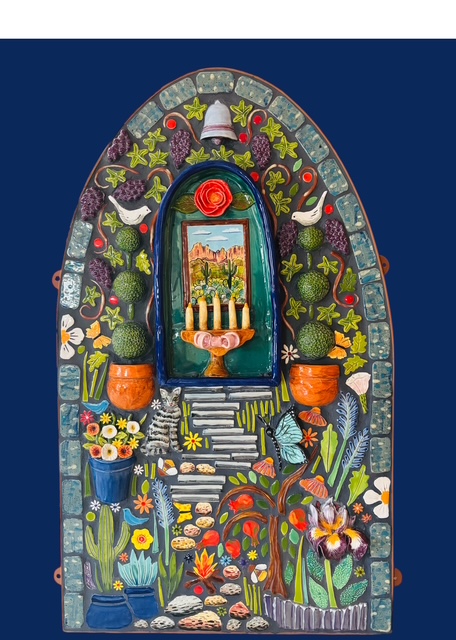 Here is a custom mosaic wall plaque portraying a garden setting featuring an altar. A pair of white doves and flowering ocotillo cactus frame the altar. The sculpted Rose above and Datura below embrace the upper and lower while the Roadrunner and Jackrabbit seem to acknowledge each other as well.