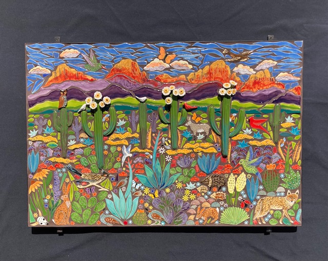 Like the ‘Saguaros in Bloom’ mural, it has many critters, cactus , birds, purple and orange mountains with low and high relief applications. It is a piece that needs to be seen with the naked eye to appreciate all the details.