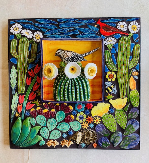 A shadow box of a Cactus wren atop a flowering saguaro cactus, surrounded by mosaic cactus tile, prickly pear, agave, saguaros, flowers, cardinal and javalina family. 15″ frame.