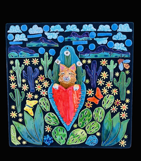 “The Watcher” A lone Coyote sitting and watching. This is a large mural with low relief Saguaro cactus tile, all handmade tile, of a coyote, sculpted birds saguaro flowers, and more. 36″ x 24″. Hangs indoor or out.