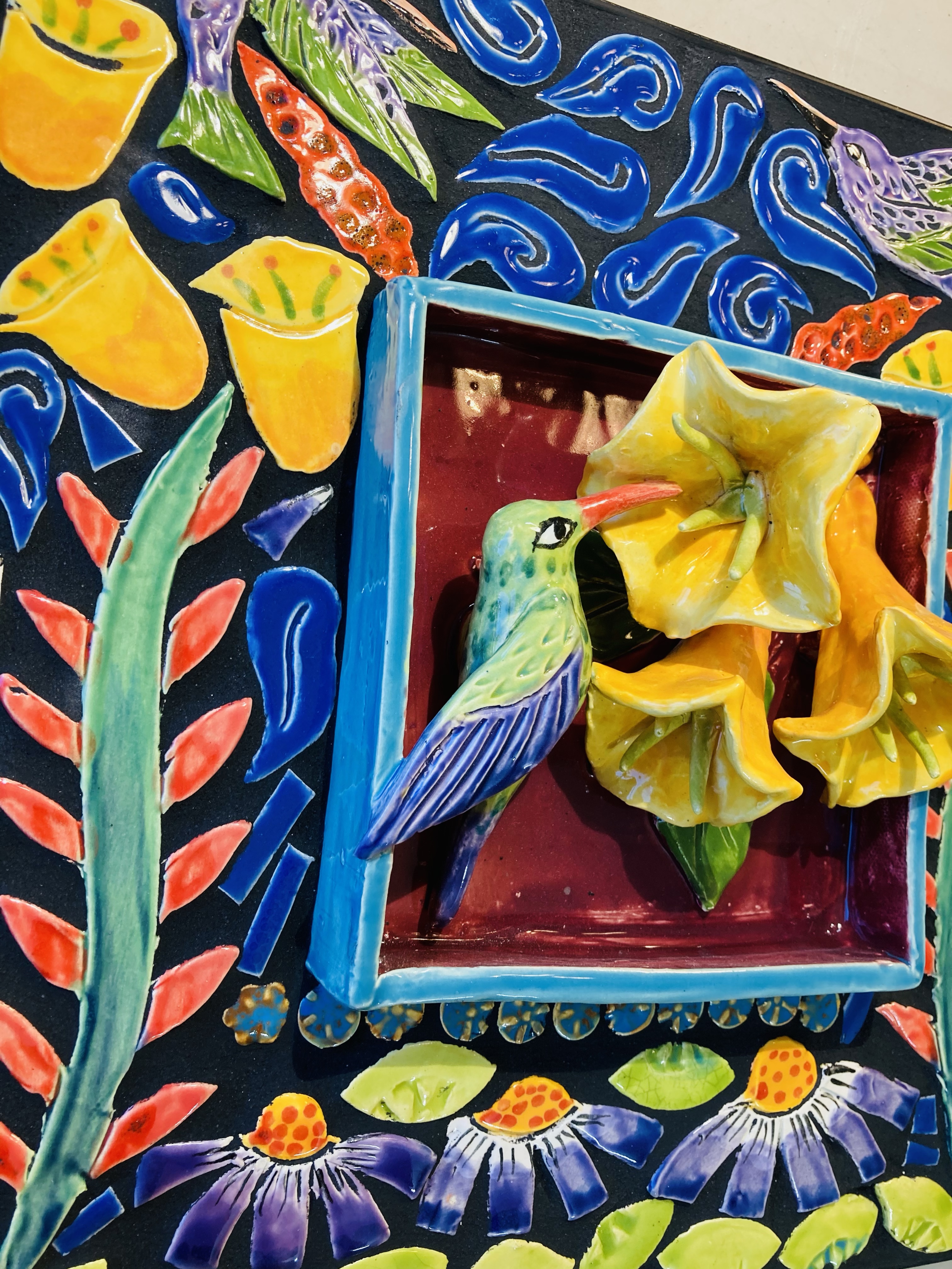 A sweet scene you might be lucky enough to see daily in the garden… a busy hummingbird searching for nectar from a honeysuckle bush. This is a high relief ceramic sculpture shadow box surrounded by handmade mosaic tile, set in a wrought iron frame, ready to hang on your wall. Available direct! And just in time for Mother’s Day.