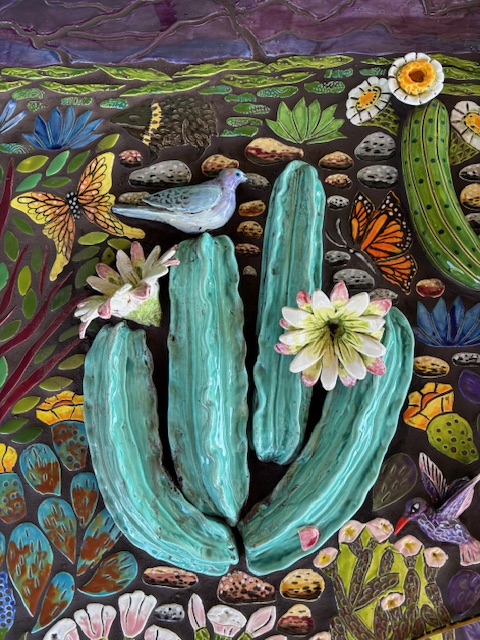 36″ x 24″ Mosaic Panel, high relief sculpted saguaro cactus, cactus flowers, gila woodpecker, cardinal, quails, bird of paradise flowers, handmade tile. SOLD!