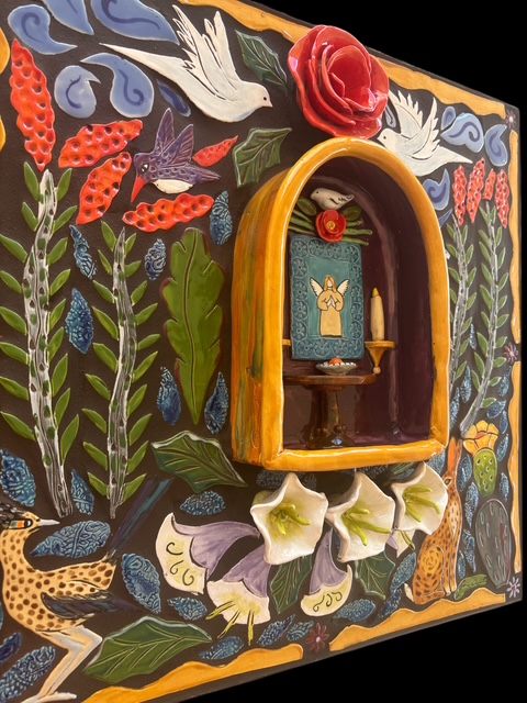 A hand made ceramic altar with an angel. Ceramic Candles, a cross, and a bowl of oranges decorate the table. On the outside is a sculpted giant rose on top and 3 sculpted agave tiles in high relief. All the tile is hand cut from fresh clay, kiln fired, set into a wrought iron frame, grouted in for a finished in-laid look.