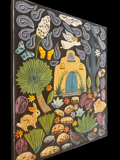 Mission and Donkey Mosaic Wall Art. This mosaic is a portrait that displays a place of serenity. The Sonoran Desert can be a spiritual place full of life and color featuring birds, butterflies, dragonfly, hummingbird in a whimsical sky. All tile is handmade, kiln fired and set into a 16″ x 8″ wrought iron frame, ready to hang.
