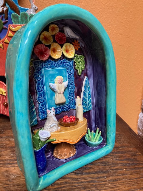 Beautifully detailed Angel Shrine Ceramic (shadow box) Altar is something to behold. An inspiration piece to fill your prayer closet, to lay homage, or honor a loved one past. Even if it might be your cat or someone who loved cats! Hand built from slab clay, high fired with luscious glazes, captivating detail of an angel, cat, bowl of pomegranates, candle sticks on the table top, flower swag, pitcher with lily, etc.