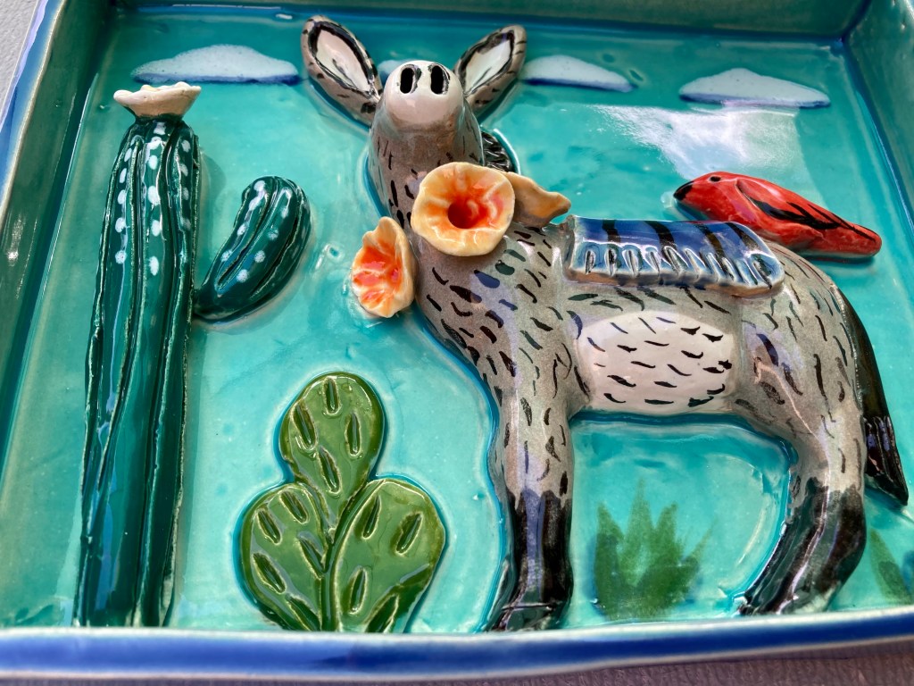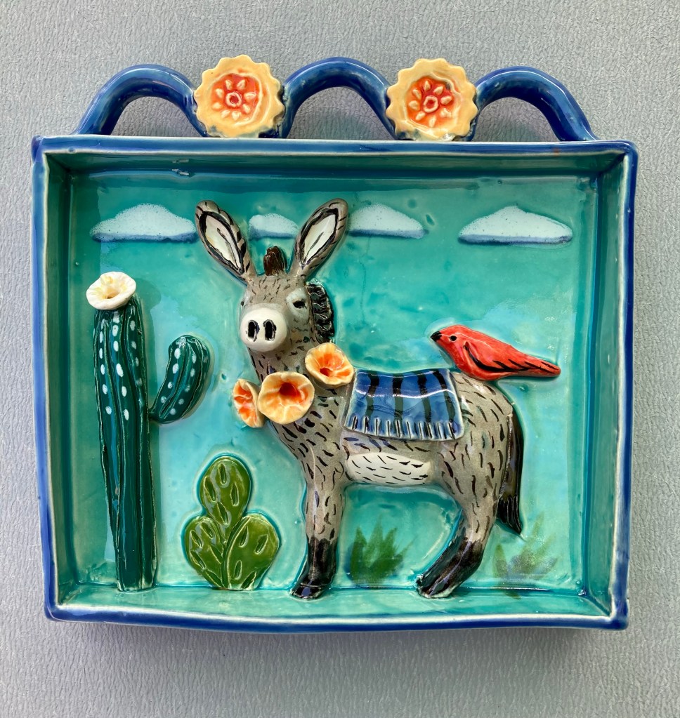 Desert critter charm. This ceramic shadow box holds a sweet 3-d image of a donkey and her best friend, Red! (Bird). They are forever companions roaming the through the desert with cactus, teal sky and clouds. Hand built, hand sculpted and one of a kind. A great gift for anyone who adores donkeys. Measures 7.5 x 7.25