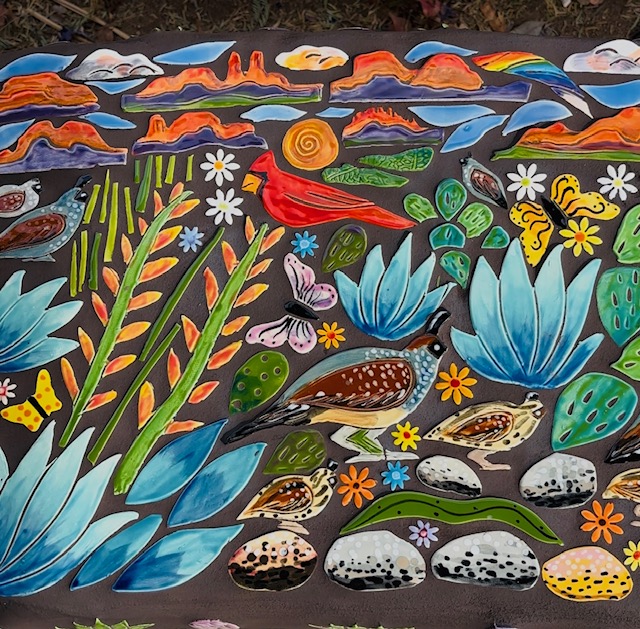 Class Includes pre-made tile by Robin to choose from. The cost is $995.00 and includes bench, tile, glue, grout, tax and lesson. Tiles include up to 8 large size tiles (3″ to 5″ tiles) and all the filler tile to complete the bench top and sides. It is an intensive 2 day workshop and will be held outdoors. You will be bending over, squatting, and using elbow grease to complete your bench. It will be held at Robin’s home studio.