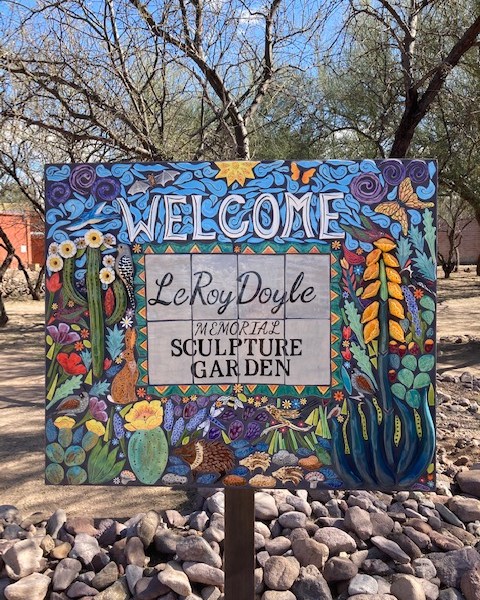 The angel is high relief, high fired ceramic sculpture. The tiles are hand cut, glazed, kiln fired, arranged, glued on a back board within the wrought iron frame. All grouted in to give it an inlaid look.