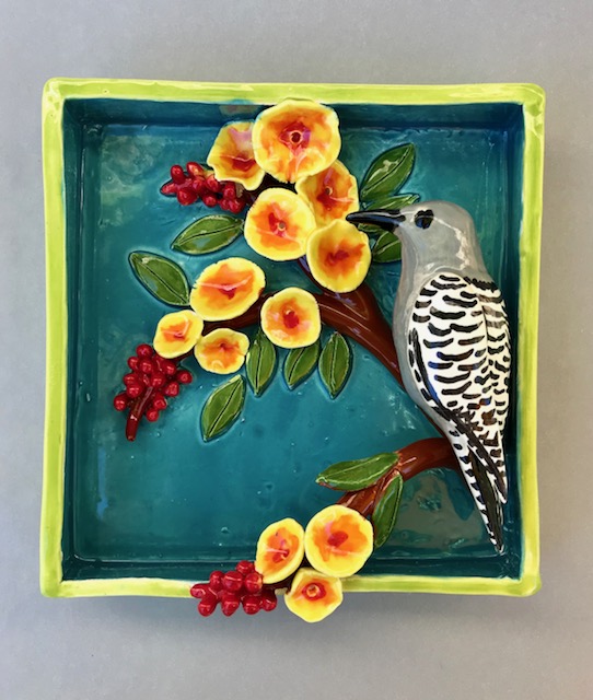 A sculpted ceramic shadow box with 3-D Mexican Bird of Paradise with Gila Woodpecker. Well crafted this charming art piece can go in any room of the house. Gila Woodpeckers are native to the Sonaran Desert, AZ. Measures 5.5″ Square Price includes shipping. USA only, Made to order. Allow 2-3 week delivery.