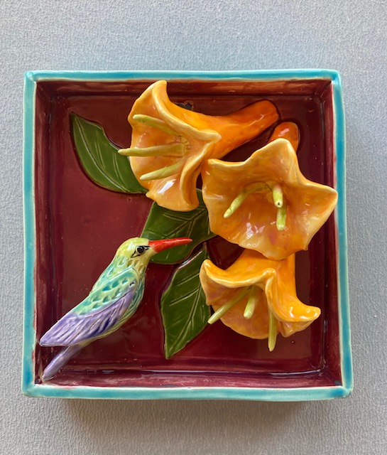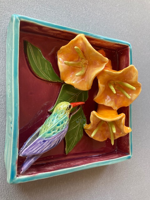 A sweet Ceramic Shadow box for the wall or on a shelf. The wine background makes the hummer and flowers pop. Measures 5.5″ square.