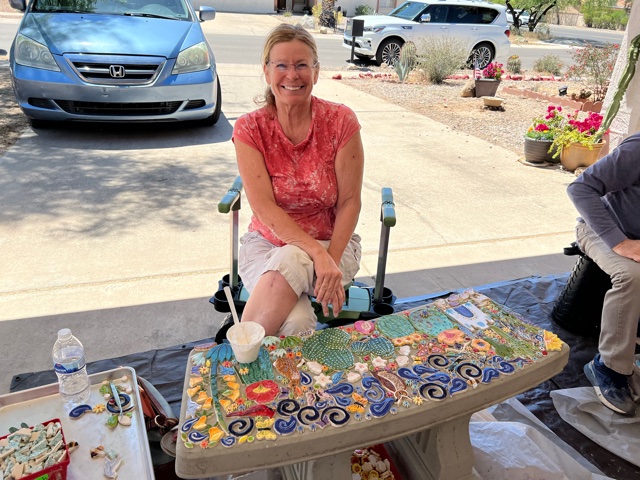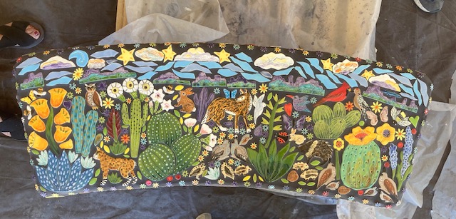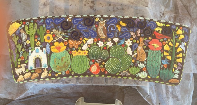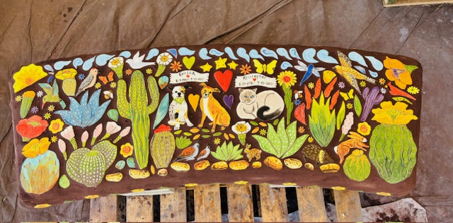 Many people have taken my mosaic classes over the years and I only make a certain number of tile for each class. For instance, if you want a certain number of Saguaro tiles or barrel cactus or a cat, etc…then you need to tell me. Otherwise, it’s the luck of the draw when everyone gets to the workshop at the same time. But I promise there are always plenty of beautiful and whimsical tiles for everyone to choose from.