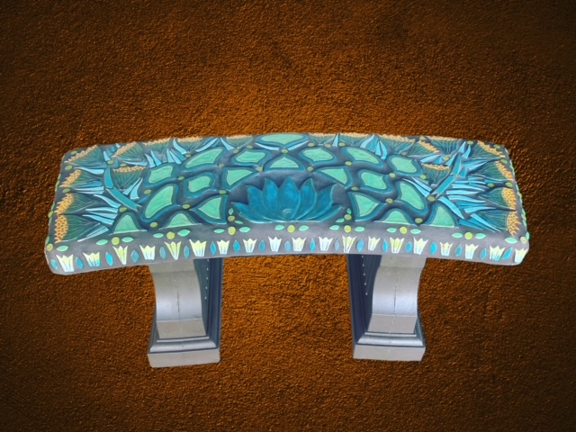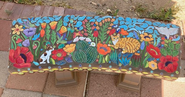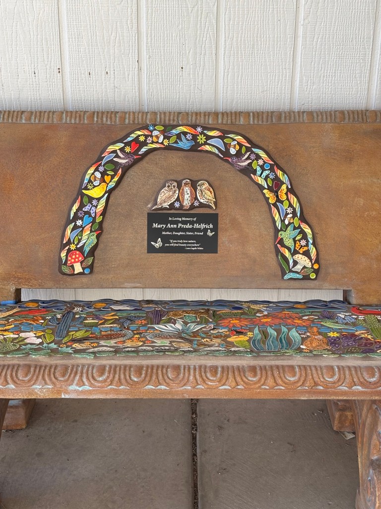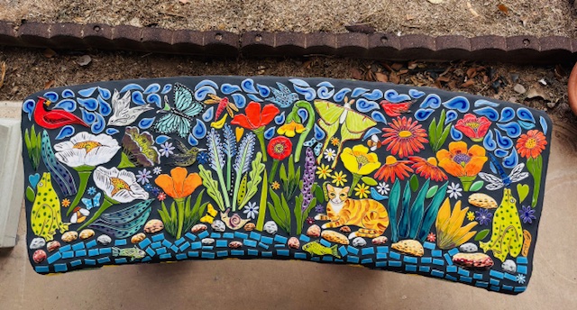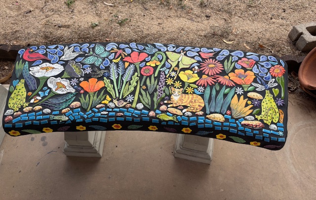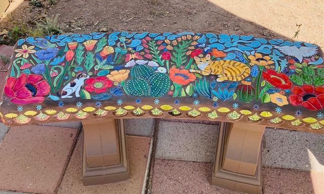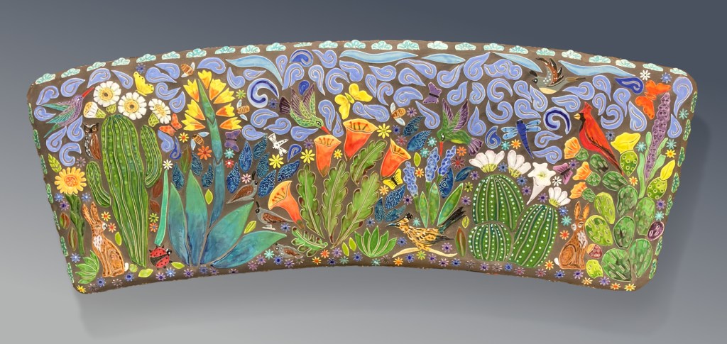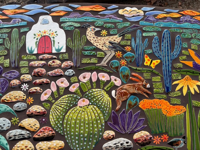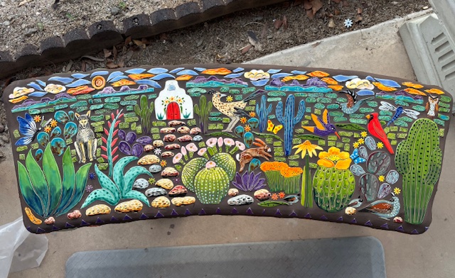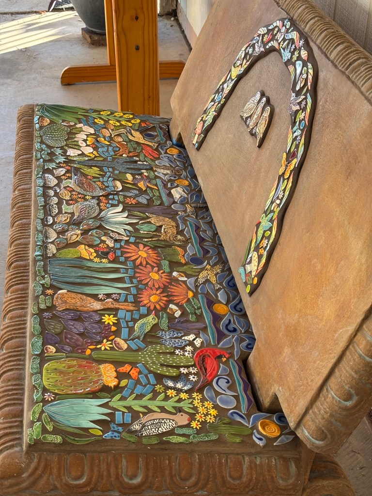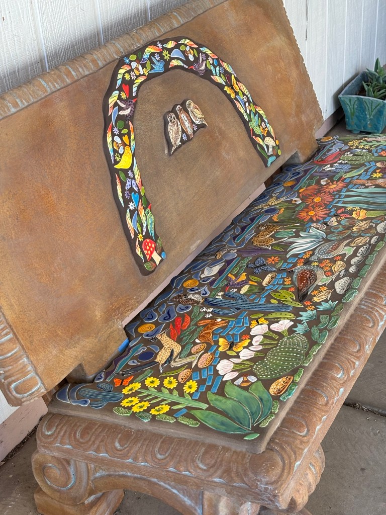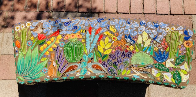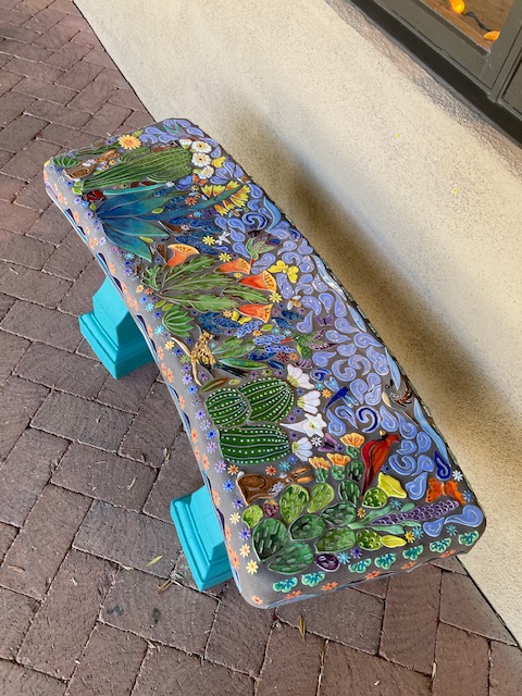 When I walk through the desert I am in awe of the amazing creations God has made. I am so fortunate I live in such a unique landscape of cactus, critters and sunsets. Rich with color and culture. This mosaic bench, titled Desert Joy is a reflection of a place of peace and wonder.”