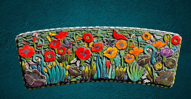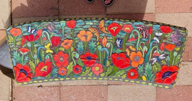 Hot off the press! I just completed this lovely Bird and Butterfly Poppy Bench. It could be a perfect addition to your patio, courtyard or entryway. Just in time for spring. All tile is handmade and handglazed. Each individual piece is kiln fired to over 2000 degrees. The bench is concrete and reinforced with rebar. Comes in 3 pieces: seat and 2 legs. Now available at WildeMeyer Gallery