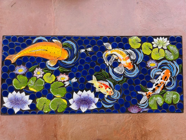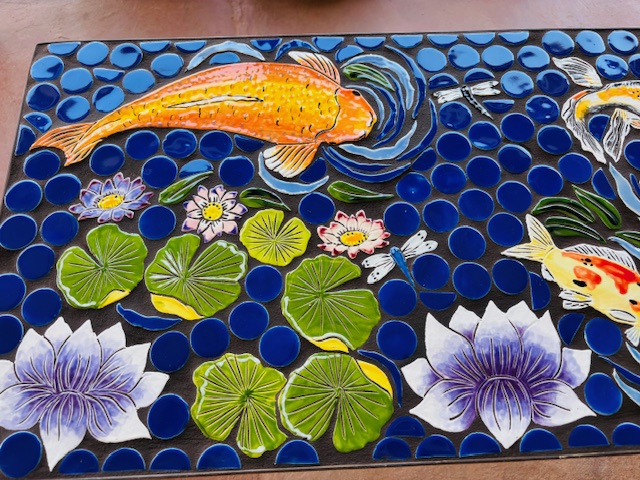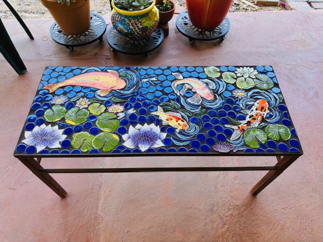 So here is my interpretation of a Koi pond with handmade tile of a large gold fish with exotic white, orange and black finned fish. Combined with Lily pads, lotus flowers, floating leaves and dragonflies. All the colors are so striking against the cobalt blue dots that portray the quiet area of a pond. All the tile is glazed, kiln fired, and set into a wrought iron patina rust table frame. Grouted and sealed.