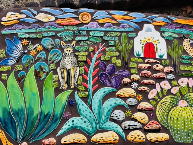 A stunning mosaic tile image of a lush desert landscape and a hint of abstract mountains. This bench is something to behold! Exotic cacti, flowering aloe, agaves. Don’t miss the (camouflaged) roadrunner, the obvious coyote and big bold cardinal. This design is a hard one to give up! But it is available at Wilde Meyer Gallery in Tucson. This would be a wonderfully perfect gift for mom on Mother’s Day.