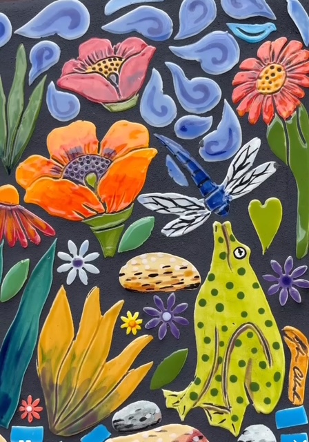 Here’s a refreshing bench design. Sitting by the creek “pondering” amongst the lupine, daisies, poppies, butterflies, moths, and birds, with the flanking frog footman and tiny fish tiles you can almost hear the babbling of the brook. This oh -so -charming mosaic tile bench would be a perfect addition to your courtyard water feature.