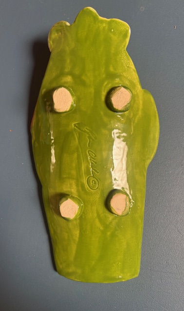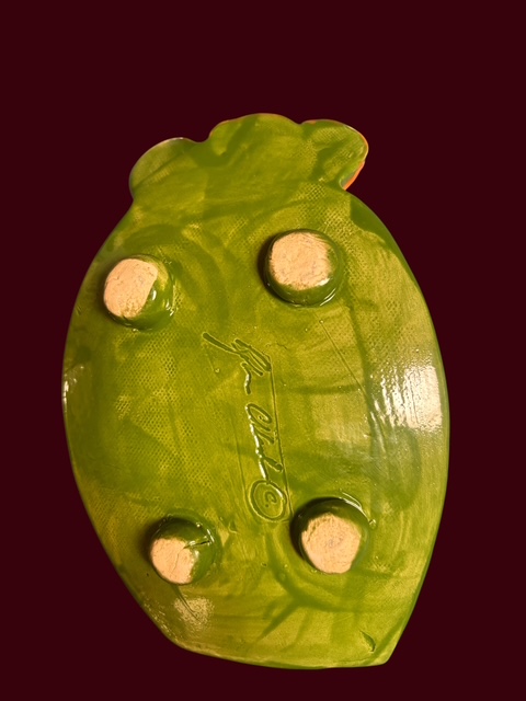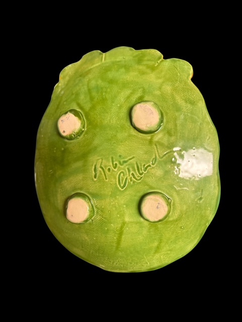 Handmade from slab clay it has a curved shape with feet. Kiln fired with layers of greens, white, red, and yellow glazes.
