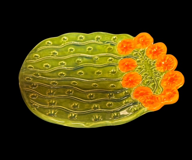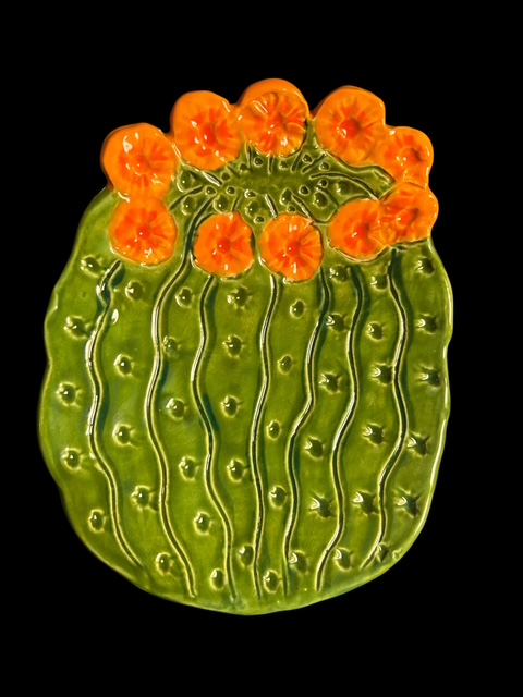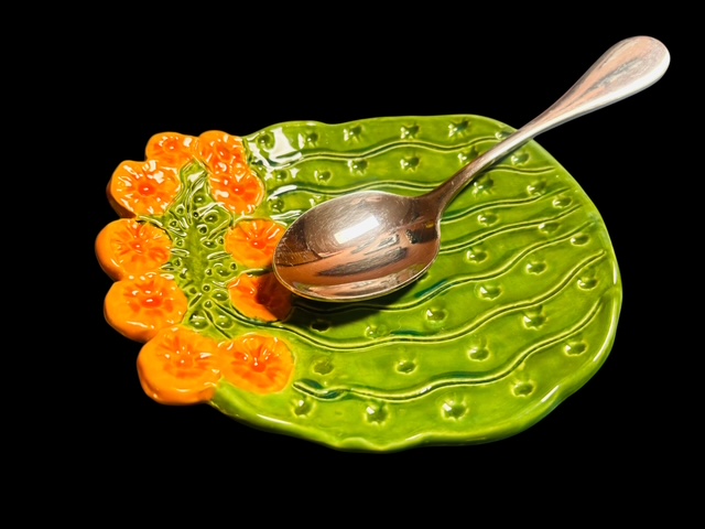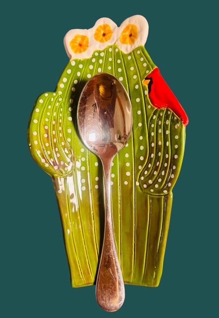 A charming and whimsical ceramic spoon rest reflects the beautiful and iconic Saguaro Cactus of the Sonoran Desert.