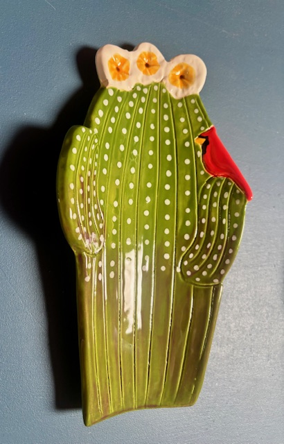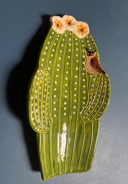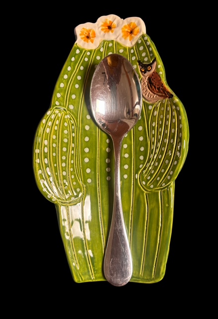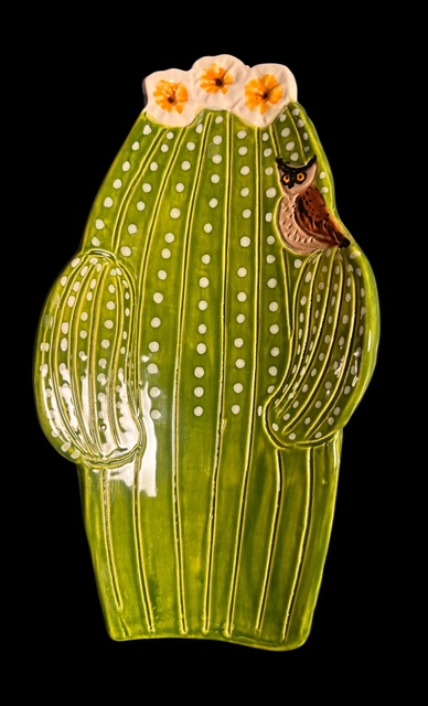 A charming and whimsical ceramic spoon rest reflects the beautiful and iconic Saguaro Cactus of the Sonoran Desert. This one is special with a Great Horned Owl sitting in the arm hooting away,