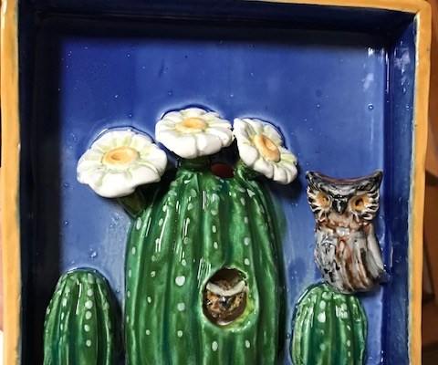 The past several weeks I have produced larger work for indoors or outdoors. This bench is titled: AGAVE BENCH WITH FLOWER STALKS Handmade tile on a concrete bench 38″ long by 14″ wide by 15″ high with a 3 ” thick top reinforced with rebar Currently at Harlow Gardens, Tucson, AZ I will be at the Moonlight Art Market at Harlow Gardens this Saturday, April 22 from 6:00 to 8:30. This invitational event will have several other artists, live music and refreshments Come join the fun. Click any photo to enlarge. QUAIL TREE OF LIFE MOSAIC Handmade tile placed in…